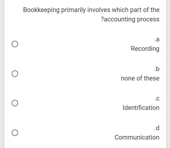 Solved Bookkeeping Primarily Involves Which Part Of The Chegg Com